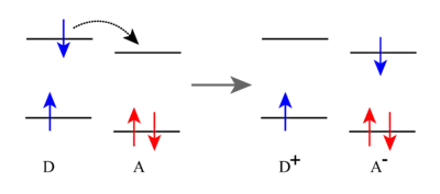 It is common to describe where electrons reside as electron bands in bulk materials and electron orbitals in molecules. For the sake of expedience the following description will be described in molecular terms. When a photon excites a molecule, an electron in a ground state orbital can be excited to a higher energy orbital. This excited state leaves a vacancy in a ground state orbital that can be filled by an electron donor. It produces an electron in a high energy orbital which can be donated to an electron acceptor. In these respects a photoexcited molecule can act as a good oxidizing agent or a good reducing agent.