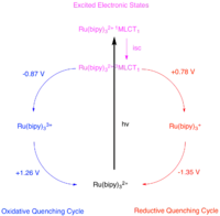 The long-lived triplet excited state accessible by photoexcitation is both a more potent reducing agent and a more potent oxidizing agent than the ground state of the catalyst. Since sensitizer is coordinatively saturated, electron transfer must occur by an outer sphere process, where the electron tunnels between the catalyst and the substrate.