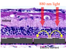 Photovoltaic retinal prosthesis is a technology for restoring sight to patients blinded by degenerative retinal diseases, such as retinitis pigmentosa and age-related macular degeneration (AMD), when patients lose the 'image capturing' photoreceptors, but neurons in the 'image-processing' inner retinal layers are relatively well-preserved.[1] This subretinal prosthesis is designed to restore a patients' sight by electrically stimulating the surviving inner retinal neurons, primarily the bipolar cells. Photovoltaic retinal implants are completely wireless and powered by near-infrared illumination (880nm) projected from the video goggles. Therefore, they do not require such complex surgical methods as needed for other retinal implants, which are powered via extraocular electronics connected to the retinal array by a trans-scleral cable.[2] Optical activation of the photovoltaic pixels allows scaling the implants to thousands of electrodes.