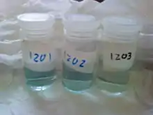 Phycocyanin is a pigment-protein complex from the light-harvesting phycobiliprotein family, along with allophycocyanin and phycoerythrin.[1] It is an accessory pigment to chlorophyll. All phycobiliproteins are water-soluble, so they cannot exist within the membrane like carotenoids can. Instead, phycobiliproteins aggregate to form clusters that adhere to the membrane called phycobilisomes. Phycocyanin is a characteristic light blue color, absorbing orange and red light, particularly near 620 nm (depending on which specific type it is), and emits fluorescence at about 650 nm (also depending on which type it is). Allophycocyanin absorbs and emits at longer wavelengths than phycocyanin C or phycocyanin R. Phycocyanins are found in cyanobacteria (also called blue-green algae).[2] Phycobiliproteins have fluorescent properties that are used in immunoassay kits. Phycocyanin is from the Greek phyco meaning “algae” and cyanin is from the English word “cyan", which conventionally means a shade of blue-green (close to "aqua") and is derived from the Greek “kyanos" which means a somewhat different color: "dark blue". The product phycocyanin, produced by Aphanizomenon flos-aquae and Spirulina, is for example used in the food and beverage industry as the natural coloring agent 'Lina Blue' or 'EXBERRY Shade Blue' and is found in sweets and ice cream. In addition, fluorescence detection of phycocyanin pigments in water samples is a useful method to monitor cyanobacteria biomass.[3]