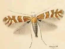 The wingspan is 9–10 mm. The forewings are shining golden-ochreous; a short whitish median streak from base; a fascia at 1/4, another at 1/2, two posterior costal and three dorsal wedge-shaped spots shining whitish, anteriorly blackish-margined; some blackish scales in disc between spots and towards apex. Hindwings are grey. The larva is green - whitish; dorsal line darker green; head pale greenish.[2]