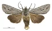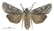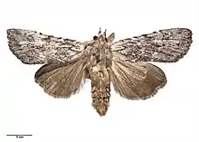 ♂, 31 mm. ; ♀, 34 mm. Head and thorax grey, strongly crested. Antennae filiform. Abdomen ochreous grey, crests slight. Forewings bright grey, irrorated with fuscous. A jagged subbasal line, strongly marked on submedian fold, where it turns abruptly towards base. A dark line across wing at 1⁄3, double, space between double lines grey (not irrorated), a dark mark on costa at 1⁄2, followed by two more above reniform. Subterminal line faint and suffused. A terminal series of black points ; a few dark points outline veins. Orbicular faint, but with a well-defined line along lower edge. Reniform defined by a dark line below and on terminal edge. Cilia grey, mixed with fuscous. Hind -wings brown, darker towards termen. Cilia brown, with fine paler line at base. Tips grey-white.[3]