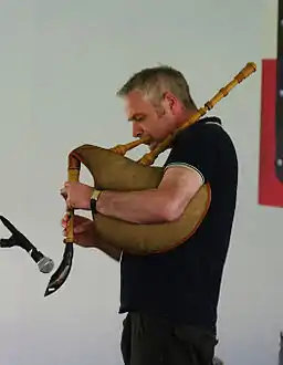 The pibgorn is a Welsh species of idioglot reed aerophone. The name translates literally as "pipe-horn". It is also historically known as cornicyll and pib-corn.[1] It utilises a single reed (Welsh: "cal", or "calaf"), cut from elder (Sambucus nigra) or reed (Arundo phragmites), like that found in the drone of a bagpipe, which is an early form of the modern clarinet reed. The single chambered body of the elder pipe has a naturally occurring parallel bore, into which are drilled six small finger-holes and a thumb-hole giving a diatonic compass of an octave. The body of the instrument is traditionally carved from a single piece of wood or bone (See photograph right). Playable, extant historical examples in the Museum of Welsh Life have bodies cut and shaped of elder. Another, unplayable instrument at the Museum, possibly of a later date, is made from the leg bone of an unspecified ungulate[2] (See photograph right). Contemporary instruments are turned and bored from a variety of fruitwoods, or exotic hardwoods; or turned from, or moulded in plastics. The reed is protected by a reed-cap or stock of cow-horn. The bell is shaped from a section of cow-horn which serves to amplify the sound. The pibgorn may be attached to a bag, with the additional possibility of a drone, which is then called pibau cwd; or played directly with the mouth via the reed-cap.[3]