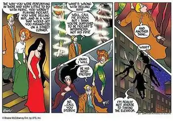 Titans would have been a gag-a-day format strip, in which Pibgorn (named Oola Inch here), disenchanted with her expected role as a fairy, usually would break away from her regular routine to wax philosophical. Unfortunately, Oola was also one of life's losers, her dialogues often resulting in misfortune, such as having a magic 8-ball roll over her, or nearly being eaten by whatever animal she's conversing with (a spider, a duckling, etc.). The strips also showed a darker side to her character, as in addition to managing dewdrops, her responsibilities include serving as the "voices-in-my-head" of disgruntled government employees, driving one to attempted homicide on at least one occasion.