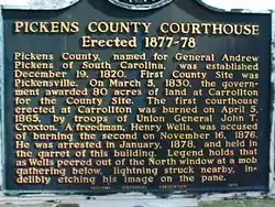 The Pickens County Courthouse in the county seat of Carrollton, Alabama is the courthouse for Pickens County, Alabama. Built-in 1877-1878 as the third courthouse in the city, it is noted for a ghostly image that can be seen in one of its garret windows. This is claimed to be the face of freedman Henry Wells from 1878.