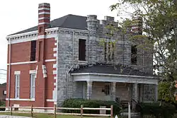 It is a two-story, brick and marble building. Its marble facade, marble porch columns, and turrets are done in a rusticated style. It was deemed notable as a county jail building somewhat unusual for its incorporation of local marble into its construction.[2]