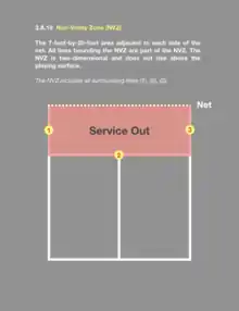 The regulation size of the court is 20 feet (6.1 m) by 44 feet (13 m) for both doubles and singles,[22] the same size as a doubles badminton court. The front service line in pickleball is seven feet from the net, six inches further than the badminton front service line. In pickleball, the front service line is called the non-volley line, or “kitchen line”, and the back service line is called the baseline. The area bounded by the non-volley line, the sidelines, and the net, inclusive of the lines, is known as the non-volley zone, or “kitchen”. The centerline runs from the non-volley line to the baseline, bisecting the rest of the court into the right and left service courts.[23] Each service court includes the lines enclosing that service court, except the non-volley line, which is part of the non-volley zone.