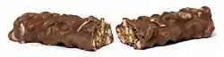 Picnic is a brand of chocolate bar consisting of milk chocolate and peanuts, covering chewy nougat, caramel, biscuit and puffed rice. Picnic bars are lumpy in shape. It is sold in Australia, parts of Canada (such as Quebec), New Zealand, New York City, San Francisco Bay Area, India, Ireland, Russia, Ukraine, South Africa (packaged as "Lunch Bar"), Ireland and the United Kingdom. The UK and Indian versions differ from the Australasian version in that they also contain raisins. Picnic is an acronym that stands for “peanuts in caramel nougat in chocolate”. Due to sugar taxes and other demands the bar is now 32g in the UK