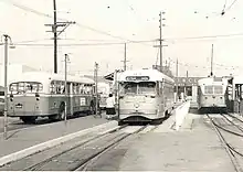 Dissatisfied with PE’s service and fares, the City of Santa Monica began running its own bus service along Pico Boulevard on April 14, 1928.[3] The combination of Santa Monica’s bus and the Yellow Car offered a lower fare than PE between Santa Monica and LA.[4] PE eventually discontinued its Pico bus line, and in 1935, the Los Angeles Railway and Santa Monica made their partnership permanent with the construction of the Rimpau Loop, a bus-to-streetcar transfer station.[5][6]