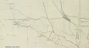 Mentry drilled three wells in 1875 and 1876 that showed promise, but the "gusher" came with the fourth well. Mentry began drilling Well No. 4 in July 1876 and struck oil on September 26, 1876, at a depth of 370 feet (110 m); the well immediately began producing 25 barrels per day (4.0 m3/d).[10] Well No. 4 was drilled with great difficulty since "the railroad had not then been completed, there was no road into the canyon, water was almost unattainable, and there were no adequate tools or machinery to be had."[15] Mentry used his mechanical skills to create improvised tools, including a drill-stem he built out of old railroad car axles, which he purchased from the Southern Pacific and welded together.[14] When Mentry drilled the well to a depth of 560 feet (170 m) in 1877, the oil spurted to the top of the 65-foot (20 m) derrick,[10] increasing the production to 150 barrels per day (24 m3/d).[16] After Well No. 4 proved to be a success, Mentry constructed the first oil pipeline in California from Pico Canyon to the refinery in Newhall, later extending it 50 miles (80 km) to the ocean at Ventura, California.[15][17]