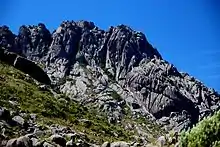 Its name means Black Needles Peak, because of the sharp dark rocks on its top, which give it a distinctive shape. The peak's massif is known as Itatiaia, which means "stone with many sharp points" in Tupi. The highest rock, with the summit, is known as Itatiaiaçu, or simply Açu (a Tupi suffix meaning "big") among Brazilian mountaineers.