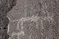 There are ten figures in the Picture Rock Pass petroglyph group. Three are human-like figures. One of these is a small stick figure in the lower left corner of the grouping. The second human figure is a middle-size figure along the bottom to the right of center. The largest bipedal figure is more interesting. While it appears to be a human figure, it also has large horns and what may be a second set of arms. This suggests it may represent a spirit figure. The other seven figures depict four-legged animals. They could be game animals or hunting dogs. One of the animals in the center of the petroglyph grouping appears to have a rider. However, experts note that the patina of the riding figure is different than the four-legged animal it is riding on or any of the other figures. This indicates that the rider was probably added after the original carving was done. If that is true, the original figure may have been a mountain sheep or another game animal.[6][8]