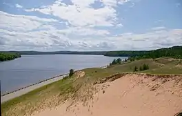 In the late 19th century, loggers in the area built a wooden log slide from the top of the dunes at the Grand Sable Banks to Lake Superior below to facilitate the transportation of timber from the area.[16] The location is a popular spot to view the Grand Banks and climb on the dunes. Visitors may also take a trail from the Grand Sable Visitors Center near the eastern end of the dunes or stop along a section of the dunes that border on Grand Sable Lake.