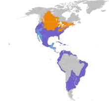 They are most commonly found throughout North America, Central America, the Caribbean, and South America year round. During the summer breeding season, they are most prevalent in central, northern and northeastern Canada.[3] If they live in an area where the water freezes in the winter they will migrate. Migrating birds generally meet with year-round birds in September and October.[15] They migrate at night.[3] Most migratory birds leave in March or April.[15] They make occasional appearances in Europe and Hawaii.[3] In the United Kingdom, pied-billed grebe visits have numbered 45 sightings as of 2019, appearing generally in October to January.[16] One bird in England bred with a little grebe, producing hybrid young.[17] It is the only grebe on record to have visited the Galapagos Islands.[18]