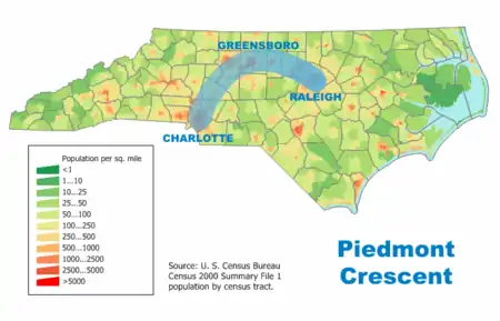 The Piedmont Crescent, also known as the Piedmont Urban Crescent, is a large, polycentric urbanized region in the U.S. state of North Carolina that forms the northern section of the rapidly developing Piedmont Atlantic megalopolis (or "megaregion"), a conurbation also known as the "I-85 Boombelt", which extends from the Raleigh area [1] to Atlanta, Georgia in the southeastern United States.