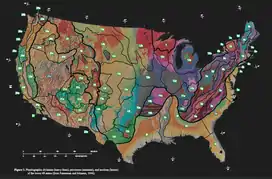 Most of the features within the Piedmont physiographic province of North America lie either on the eastern border where the plateau plunges onto the Atlantic Coastal Plain at the Fall Line, in the broad valleys of the river systems, or on the western border where Piedmont Mountains occur. Occasionally, due to diverse rock formations, folds, and outcroppings, these mountains can rise at various locations across the Piedmont like the Uwharrie Mountains in North Carolina or the Pine Mountain Range in Georgia. Most of these mountains or hills are the eroded remnants of ancient mountain ranges.[2] Some, like Stone Mountain in Georgia, are solitary rock domes called monadnocks which become further exposed with erosion.