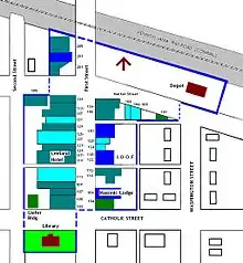 - 110- Flat Iron Hotel; Italianate, c.1880 (C) Across from the Depot is the former Flat Iron Hotel. Contemporary to the Depot, it is the oldest surviving commercial building in the district. Three large, round-arched openings remain on the first floor main or north facade and are reminiscent of the days when the building housed the town's post office, an office, and other commercial uses. The main facade is enhanced by ornate brickwork on the cornice. Detailed brick pavers form the sidewalk in front of the building.[2]