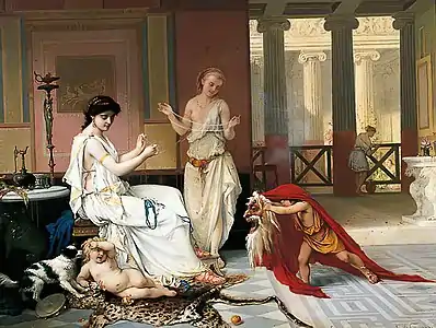 In 1855, Coomans contracted cholera in Varna and left the battlefields to recuperate in Constantinople, then Greece, and Italy. He married Adelaïde Lacroix (1838-1884) in Albania in 1856 and the couple moved to Naples where they lived until 1860. There his exposure to the excavations in Pompeii inspired him to create genre paintings of antiquity in the Neo-Pompeian style. Coomans moved to Paris in 1860, where his daughter Heva was born on May 2, 1860. His second daughter, Diana, was born on August 16, 1861. Coomans exhibited regularly at the Paris Salons and his scenes of family life in ancient Rome sold well. His wealth enabled him to build a Pompeian villa of his own on a piece of land next to the Bois de Boulogne between 1874-1877 although the structure is no longer extant. Critics thought despite their pictorial virtuosity, intimacy and rigorous compositions, his Pompeian subjects did not have the breadth of his romantic painting, nor the grandiloquent character of the compositions of Jean-Léon Gérôme, nor the fascinating eroticism of Lawrence Alma-Tadema, the two recognized masters of the Pompeian genre.[1] His work achieved international success, though, thanks to its photographic and lithographic reproductions. He also instructed and greatly influenced his two daughters, who both became successful painters as well, specializing, like their father, in portrayals of inhabitants of ancient Pompeii with their father's manner and feeling of color.[5]