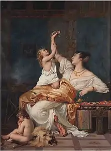 In 1847 he married the widow Zoé van Male de Brachene (1807-1848), whose husband, Captain Prosper Renoz, had died in Algeria. His son Oscar was born in 1848 but his wife died shortly after the birth, plunging the artist in a deep depression. Although his work, Attila's Last Charge in the Plains of Châlons-sur-Marne had garnered a vermeil medal in Brussels that year he did not paint for two years but traveled to Italy and Palestine. Then in 1854 and 1855, he joined his military friends from Algeria and served General Aimable Pélissier in the Crimean War as a military painter.[1] During this period he painted historical medieval subjects and portraits.[2] He worked with models both in studios and in exterior settings and his portraits, featuring exotic costumes, jewelry, and dusky sensual looks yet produced with a subtlety of tone and color were greatly prized by European collectors.[3] He also painted children at play, a popular theme in late nineteenth-century European and American Art as childhood was studied in terms of its significance to personal development and education.[4]