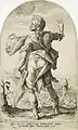 According to the RKD the jawbone is from a cow.[2] The jawbone was meant however to symbolize the jawbone of the ass that was used by Samson to slay 1,000 Philistines. The portrait has been identified "Verdonck" because of the engraving made by Jan van de Velde with a short poem describing the subject, which loosely translated, meant "This is Verdonck, the bold guest whose jawbone attacks everyone/ By not distinguishing between high or low born, he landed in the work house". The poem could be seen as moralistic warning to rederijkers whose satiric discourses went too far. Both Hals and his contemporary Salomon de Bray were rederijkers in Haarlem. De Bray made a pair of pendant pieces in a similar genre depicting David with his sword and Samson with his jawbone. De Bray's version shows Samson a moment later in the story, when he prayed to God out of thirst and was rewarded with the "fountain of the crier".[3] Hals' portrait shows the moment where Samson in triumph proclaims that "with the jawbone of an ass, he slayed 1,000 Philistines".