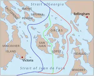 However, there are actually two straits that could be called the middle of the channel: Haro Strait, along the west side of the San Juan Islands; and Rosario Strait, along the east side.[2]
