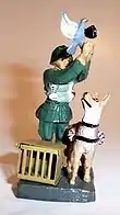 It is certain, however, that during the Second World War pigeon photography was introduced into German nurseries in toy form. From around 1935 the toy figures produced under the brand Elastolin, some of which show motifs from before 1918 with updated uniforms, began to include a signal corps soldier with a pigeon transport dog. The figurine represents a soldier in the act of releasing a pigeon that carries an oversized pigeon camera.[28]