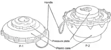 The P-1 has circular plate like body 33.5 centimeters in diameter and 14 centimeters high with a central raised pressure plate. The P-1 uses a 7.0 kilograms (15.4 lb) main charge of TNT.