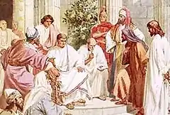 The Gospel of Mark uses the word aulē ("hall", "palace") to identify the praetorium.[4] Fearing defilement, the Sanhedrin elders did not enter the court, and Pilate's discussion with them occurred outside the praetorium.[4] Outside the praetorium proper, there was an area called the Pavement.[Jn. 19:13] Pilate's judgement seat (Greek: bēma), in which he conversed with the elders, was located there.[4]