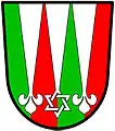 When a shield has more than one pile, and they are angled so that they touch at the base, they are described as piles in point. A few heraldry authorities from the Middle Ages such as Sir Thomas Holme and Nicholas Upton believed that whenever piles issued from the chief, they should automatically meet in point, but this view eventually fell out of favour and it has become common practice that unless otherwise specified, they should be drawn perpendicularly.[1] However, it is still possible to see examples of the previous school of thought.[2]