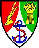 Lydney Rural District Council (abolished 1974): Argent, on a pile wavy throughout vert, a stag's head caboshed, between the attires a port between two towers, or; on a chief sable three crosses formy or.