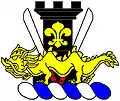Badge of Merseyside Metropolitan Council (England): On a roundel azure three mural crowns conjoined in pile [merlons outwards] or, in base two barrulets argent.
