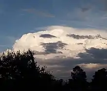 A pileus (/ˈpaɪliəs/; Latin for "cap"), also called scarf cloud or cap cloud, is a small, horizontal, lenticular cloud appearing above a cumulus or cumulonimbus cloud. Pileus clouds are often short-lived, with the main cloud beneath them rising through convection to absorb them.[1] They are formed by strong updraft at lower altitudes, acting upon moist air above, causing the air to cool to its dew point. As such, they are usually indicators of severe weather, and a pileus found atop a cumulus cloud often foreshadows transformation into a cumulonimbus cloud, as it indicates a strong updraft within the cloud.[2]