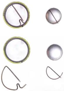 A pin-back button or pinback button, pin button, button badge, or simply pin-back or badge, is a button or badge that can be temporarily fastened to the surface of a garment using a safety pin, or a pin formed from wire, a clutch or other mechanism. This fastening mechanism is anchored to the back side of a button-shaped metal disk, either flat or concave, which leaves an area on the front of the button to carry an image or printed message. The word is commonly associated with a campaign button used in the United States and abroad during a political campaign. The first design for a pin-back button in the United States was patented in 1896, and contemporary buttons have many of the same design features.