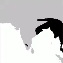 In India, there are disjunct populations in southern India. This population was recorded by Salim Ali from Antharasanthe near the Kabini reservoir. There were no records of the species from this area after the initial collection. The southern population was rediscovered from the Masinagudi area in Mudumalai in 2004.[6]
