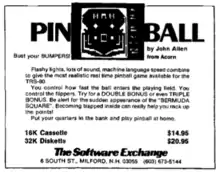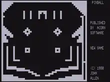 Pinball is a pinball simulation written by John Allen and published by Acorn Software Products in 1980 for the TRS-80.[1][2]