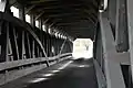 The bridge has a two-span, wooden, double Burr arch truss design with the addition of steel hanger rods. It is the only two-span covered bridge still in use. The bridge's deck is made from oak planks. It is painted red, the traditional color of Lancaster County covered bridges on the outside, but is not painted on the inside. Both approaches to the bridge are painted in the traditional white color.