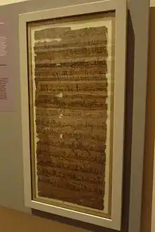 - his name appears in the very damaged first lines on the verso of Pap. B.M. 10053. This text is dated to an anonymous year 9, which stems from the reign of Ramesses XI, but might be ascribed either to his actual "year 9" or alternatively to "year 9 of the Whm Mswt", a somewhat enigmatic era this king started in his 19th regnal year. In the latter case, this text would actually stem from his 27th regnal year. This mention has often been taken as evidence that Pinehesy was in office at the time of this 'year 9' and took part in the court case which is described in the document. However, it has been pointed out that that is an over interpretation of the evidence: there is no title remaining, so the reference need not even have been to the well-known viceroy (the name was not uncommon) and even if we are dealing with the viceroy, the context is too damaged to ascertain how the name functioned in the text. E.g. it cannot be excluded that the name may have been part of some back reference to a period in the (recent) past (e.g. "the time when Pinehesy suppressed the High Priest", rather than to an actual participant in the procedures.[2]