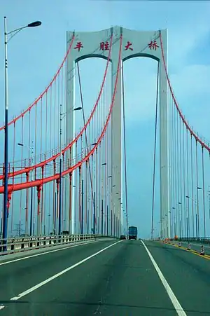 The Pingsheng Bridge (Chinese: 平胜大桥; pinyin: Píngsheng Dàqiáo) is single tower, single span self-anchored suspension bridge located in Foshan, Guangdong Province, China. Opened in 2006, the bridge has a main span of 350 metres (1,148 ft).