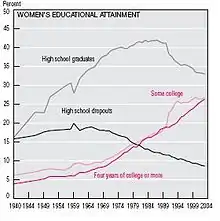 This graph shows the increase in women graduating high school and attending college, while there is a decrease in high school dropouts.