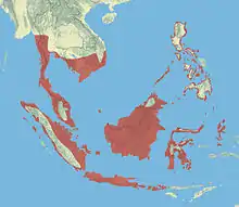 The range of the pink-necked green pigeon extends from southern Myanmar, Thailand, Cambodia, and Vietnam south through the Malay Peninsula and across the Greater Sundas (and their surrounding islands), Bali, Lombok, Sumbawa, and as far east as the Moluccas as well as the Philippines. It occupies a variety of habitats, including primary forest, forest edge, secondary forest, and coastal mangroves.[7] It favours more open environments and where it is found in association with denser forest it is typically on the edges.[10] It is also readily found in human dominated environments such as gardens, plantations and farmland. It is more common in lowlands and close to the coast, but can be found up to 300 m (980 ft) in the Philippines,[7] 750 m (2,460 ft) in Borneo[10] and 1,200 m (3,900 ft) in Sulawesi. The species is recorded as non-migratory by the Handbook of the Birds of the World,[7] but other sources have described it as making local movements.[9] A related species, the thick-billed green pigeon, covers vast distances in search of fruit, and it is likely that the pink-necked green pigeon has a similar behaviour.[11]