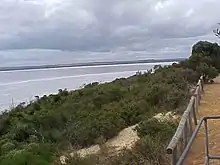 Pink Lake (previously known as Lake Spencer) is a salt lake in the Goldfields-Esperance region of Western Australia.[2] Although historically the water in the lake was visibly pink, as of 2017 it had not been pink for over ten years.[3] Salt concentration is vital to Pink Lake's pink hue, and Pink Lake may turn pink again as conditions change. It lies about 3 kilometres (2 mi) west of Esperance and is bounded to the east by the South Coast Highway.