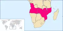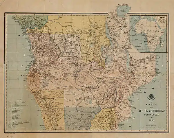 The Pink Map (Portuguese: Mapa cor-de-rosa, "rose-coloured map"), also known in English as the Rose-Coloured Map,[1] was a map prepared in 1885 to represent Portugal's claim of sovereignty over a land corridor connecting their colonies of Angola and Mozambique during the Scramble for Africa. The area claimed included most of what is currently Zimbabwe and large parts of modern Zambia and Malawi. In the first half of the 19th century, Portugal fully controlled only a few coastal towns in Angola and Mozambique. It also claimed suzerainty over other almost independent towns and nominally Portuguese subjects in the Zambezi valley, but could rarely enforce its claims; most of the territory now within Angola and Mozambique was entirely independent of Portuguese control. Between 1840 and 1869, Portugal expanded the area it controlled but felt threatened by the activities of other powers.