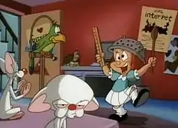 Warner Bros. network executives had reportedly wanted Pinky and the Brain to be part of a sitcom "more like The Simpsons".[2] In a press release, Warner Bros. stated that the new series was "a fresh approach to popular favorites as Pinky & The Brain move from ACME Labs to America's suburbs when they are adopted by the extremely excitable Elmyra."[3] The idea was reportedly met with resistance from the producers of the series.[4]