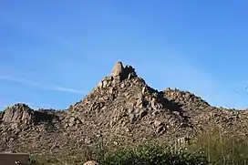 Pinnacle Peak is a granite summit located in Scottsdale, Arizona.[3] The peak rises to an elevation of 3,169 feet (966 m). It is located within the 150-acre (61 ha) Pinnacle Peak Park,[4] operated by the City of Scottsdale Park District. Part of the Sonoran Desert, the park is home to a variety of native desert flora and fauna.[5] Hikers utilize a 1.75 mile trail to explore the area,[6] though rock climbing skills are needed to reach the summit.[5]