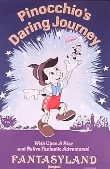 Pinocchio's Daring Journey is a dark ride at Disneyland in California, Tokyo Disneyland, and Disneyland Park in Paris. Located in the Fantasyland section of each park, this ride is based on Disney's 1940 animated film version of the classic story, which was the studio's second animated feature film.[1] The attraction tells an abbreviated version of the film, with Pinocchio escaping from Stromboli's circus and visiting Pleasure Island, ignoring Jiminy Cricket's advice. Monstro the whale makes an appearance, and Pinocchio is finally reunited with Geppetto and turned into a real boy.