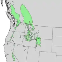 Whitebark pine (Pinus albicaulis) can be found at high elevation in the Rocky Mountains from central British Columbia to western Wyoming.[4] It occurs in the timberline zone of the Cascades and coastal ranges from British Columbia to the Sierra Nevada, as well as most high ranges between the Rockies and Cascades, such as the Blue Mountains.[4] It is also populous in subalpine forests of Montana and Idaho.[4]