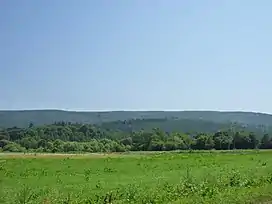 The tallest mountain in the Beskid Dukielski,[3] Piotruś is relatively flat-structured, giving it its alternative name of Płazyna.[4] The mountain is crescent-shaped, aligned roughly north-south. It is bounded to the west and south by the valley of the Jasiołka river, separating it from Ostra Mountain to the south.[2] The mountain is covered in forest, primarily old beech trees, and near the top, in birch, European mountain-ash and alder.[3] A spruce forest on Piotruś's western slope was mostly destroyed in a fire during the interwar period. A yellow sandstone rock is prominently displayed at the top of the mountain, which likely contributed to its name (Piotr – Polish for Peter – also means stone). Some of it was excavated for buildings, and several unused large blocks can be found.[4]