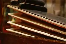 A pipe organ has one or more keyboards (called manuals) played by the hands, and a pedal clavier played by the feet; each keyboard controls its own division, or group of stops. The keyboard(s), pedalboard, and stops are housed in the organ's console. The organ's continuous supply of wind allows it to sustain notes for as long as the corresponding keys are pressed, unlike the piano and harpsichord whose sound begins to dissipate immediately after a key is depressed. The smallest portable pipe organs may have only one or two dozen pipes and one manual; the largest may have over 33,000 pipes and seven manuals.[2] A list of some of the most notable and largest pipe organs in the world can be viewed at List of pipe organs. A ranking of the largest organs in the world—based on the criterion constructed by Michał Szostak, i.e. 'the number of ranks and additional equipment managed from a single console—can be found in the quarterly magazine The Organ[3] and in the online journal Vox Humana.[4]
