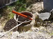 Older sewer lines of small diameter, typically 6-inch (150 mm), are made by the union of a number of short 3 feet (0.91 m) sections. The pipe segments may be made of cast iron, with 12 feet (3.7 m) to 20 feet (6.1 m) sections, but are more often made of vitrified clay pipe (VCP), a ceramic material, in 3 feet (0.91 m), 4 feet (1.2 m) & 6 feet (1.8 m) sections. Each iron or clay segment will have an enlargement (a "bell") on one end to receive the end of the adjacent segment. Roots from trees and vegetation may work into the joins between segments and can be forceful enough to break open a larger opening in terra cotta or corroded cast iron. Eventually a root ball will form that will impede the flow and this may cleaned out by a cutter mechanism or plumber's snake and subsequently inhibited by use of a chemical foam - a rooticide.