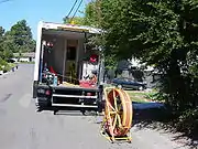 At the back end of the truck is a powered reel with video cable reinforced with kevlar or steel wire braid. Some trucks also contain a powered winch that booms out from the truck allowing for lowering and retrieval of the inspection equipment from the pipeline.